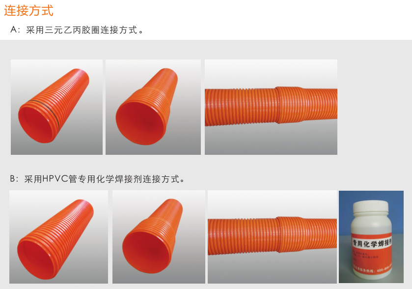高強度聚氯乙烯(HPVC)雙壁波紋管內、外壁之間呈中空環(huán)狀結構,充分利用工字鋼結構原理,提高截面 慣性矩,環(huán)鋼度高。產品具有強度高、韌性好、質地輕等優(yōu)點。產品運用開挖工程,可代替MPP單壁波紋管、玻璃鋼管、PVC-C電力管、PVC-U通信管等管材。